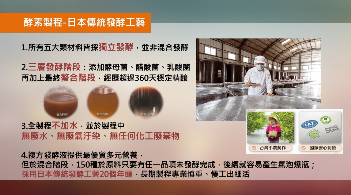 • 台灣酵素村使用源自日本之發酵工藝技術,親近自然、友善環境,全發酵製程保證:100%天然、無添加激素、無防腐劑、無廢煙、無噪音、成品不添加一滴水!