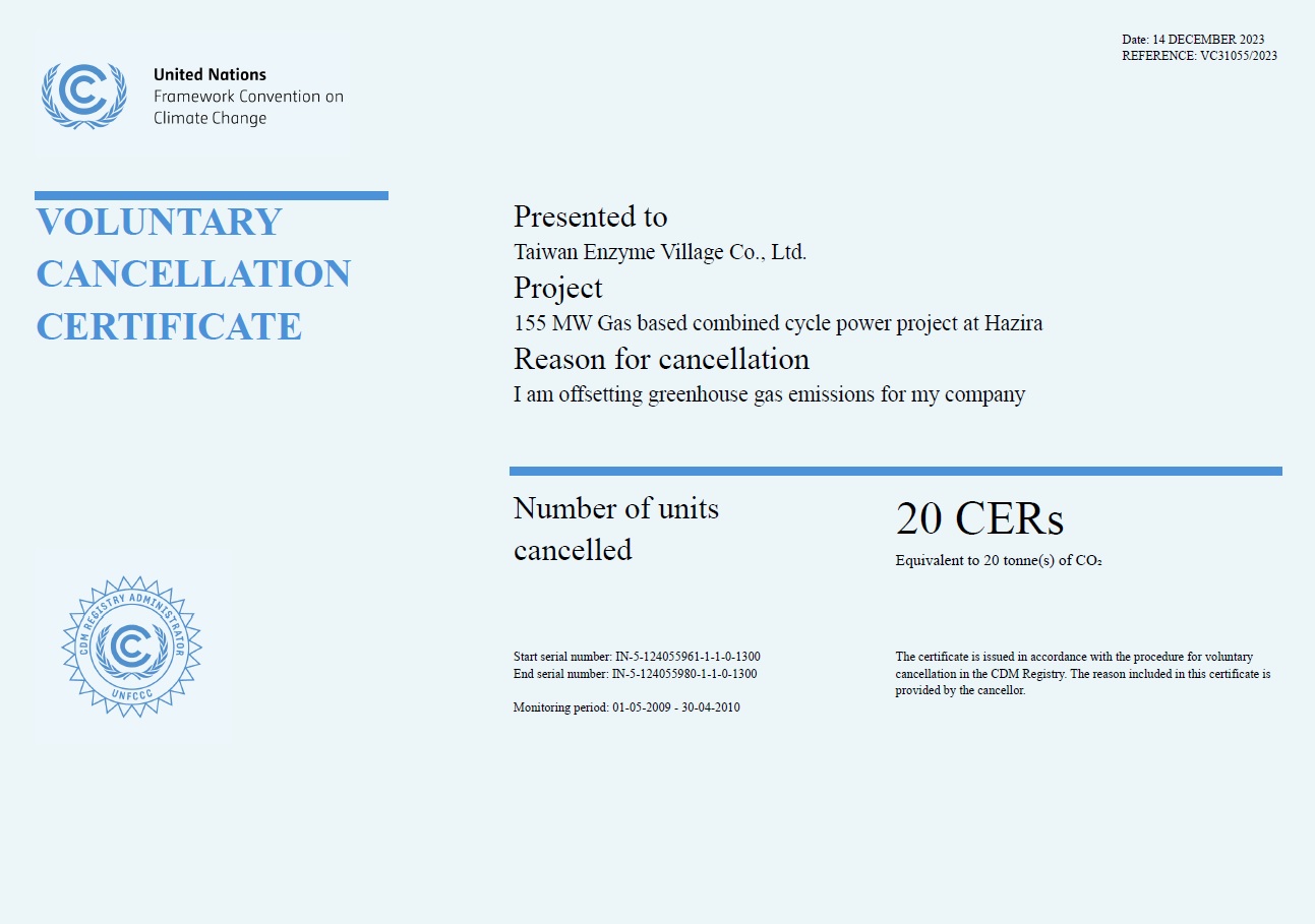 在2023年4月,台灣酵素村歷經一年多的動員、顧問課程與各部門整合協力,一步一腳印通過ISO14064工廠碳盤查、ISO14067產品碳足跡,並取得碳足跡標章,在當時成為嘉義縣首家取得蔬果發酵液碳足跡標章的企業。而在2023年12月14日,台灣酵素村更進一步向新加坡CIX碳權交易所成功交易由聯合國認可之國際碳信用,此次不只是「全台第一家」,更是「全球第一家」達成「碳中和」成就的蔬果發酵液製造商!